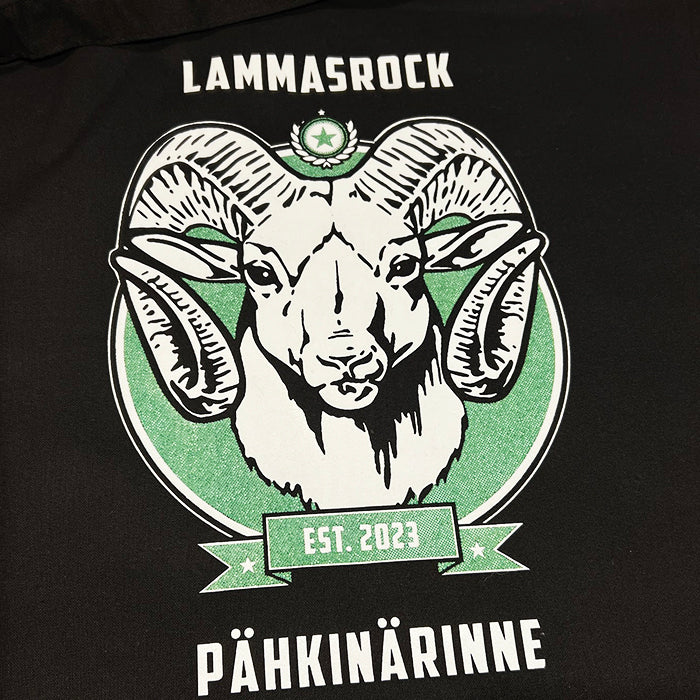 Musta kangaskassi on 100 % puuvillaa ja sen koko on n. 37x41 cm, kahvan pituus 70 cm.